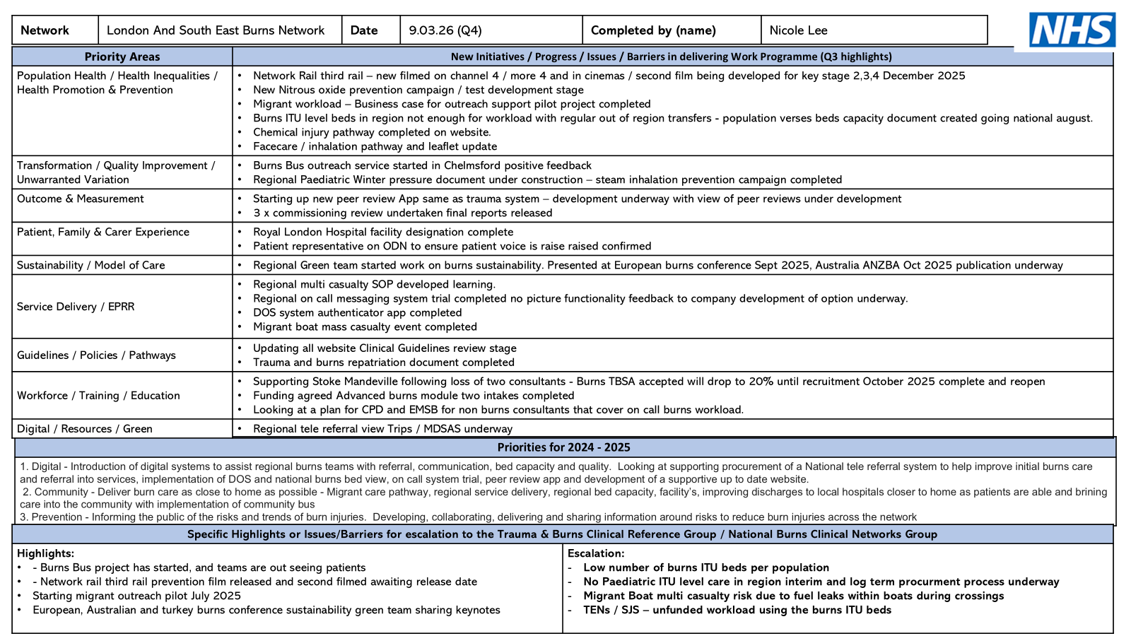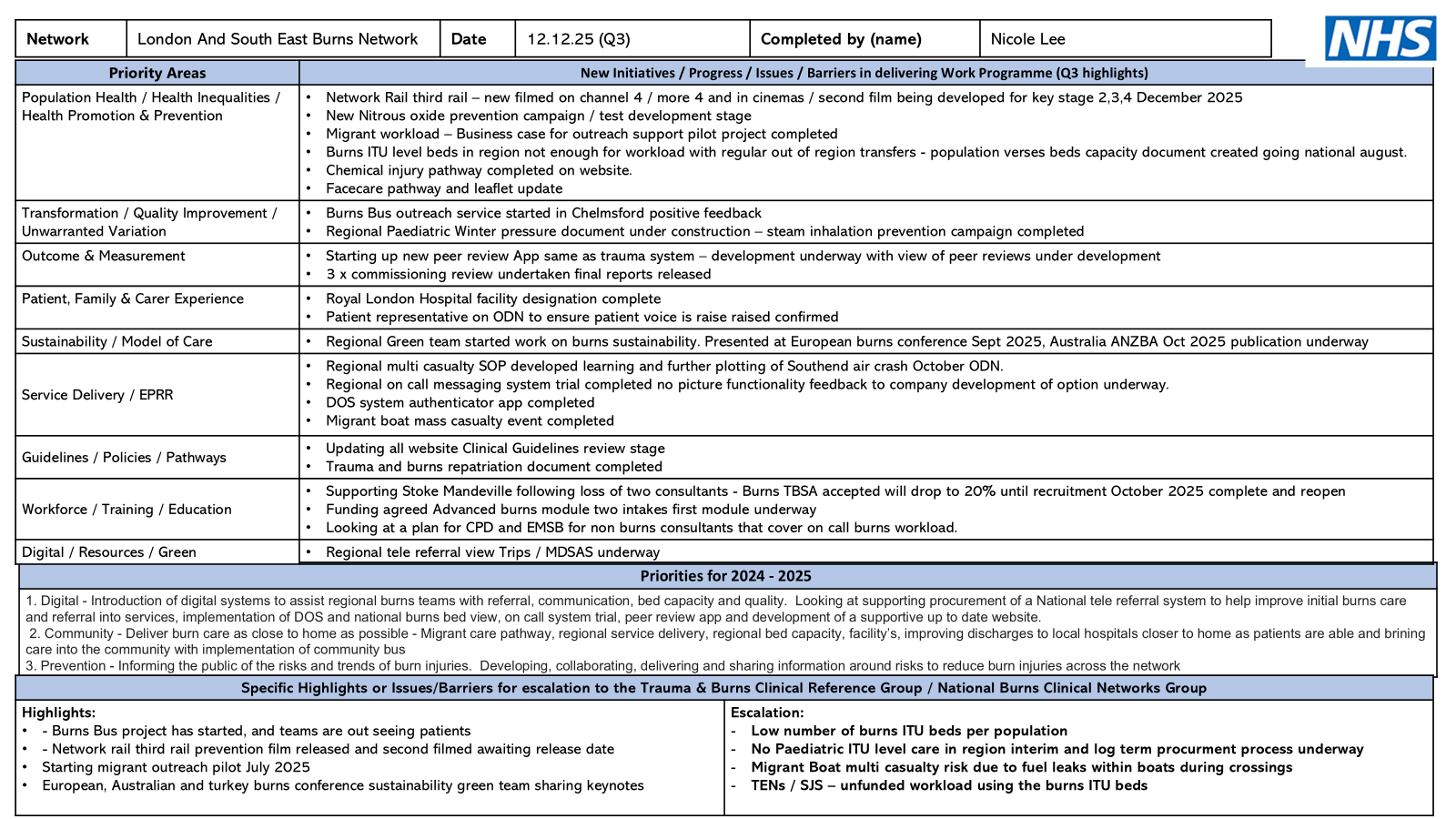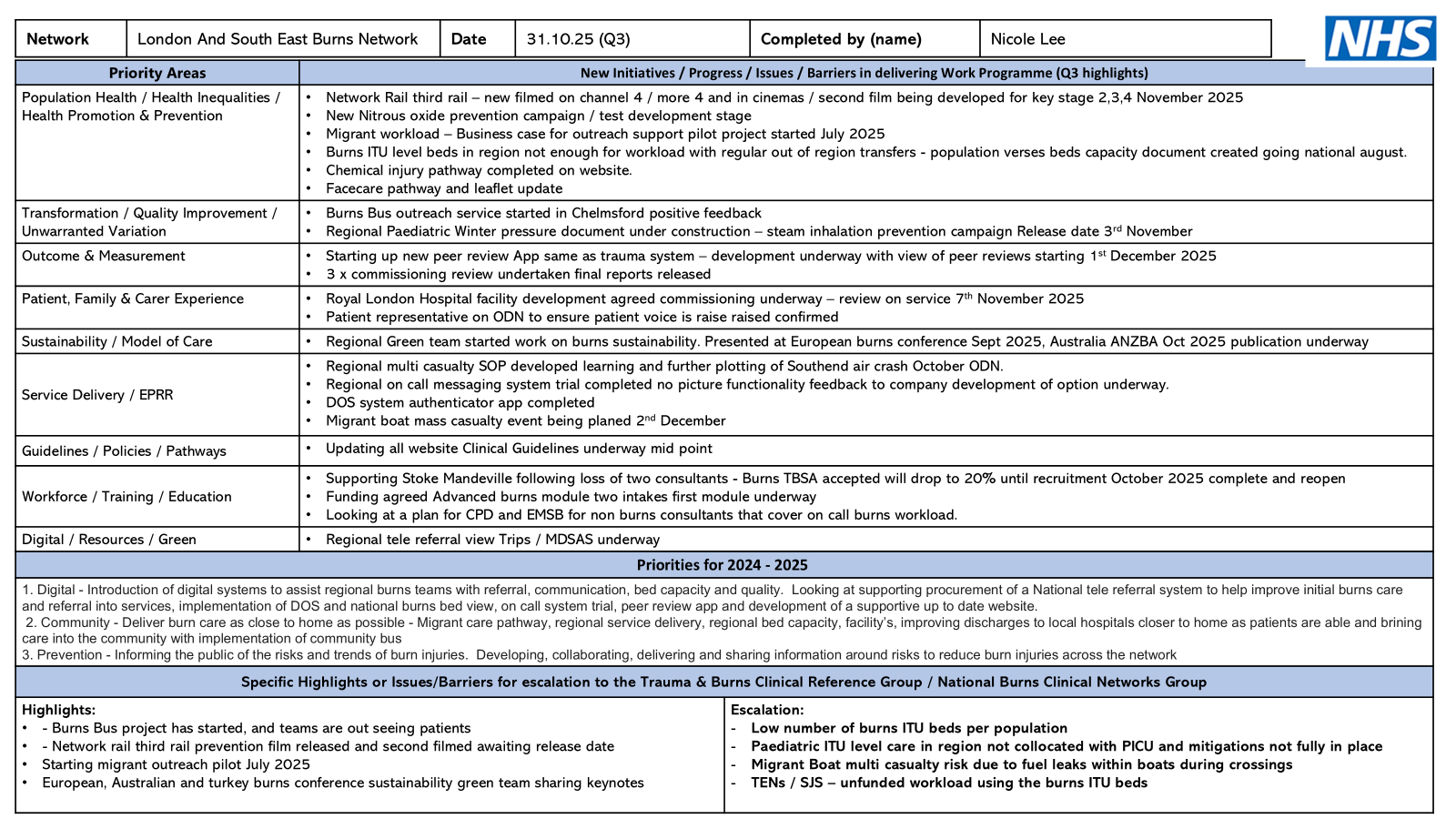 The LSEBN publishes an annual work programme for the Network team. The priorities are recommended by a meeting of the multi-disciplinary teams from each of our burn services, and the final work plan is approved by the ODN Board.
